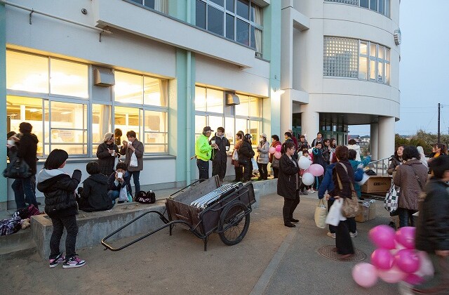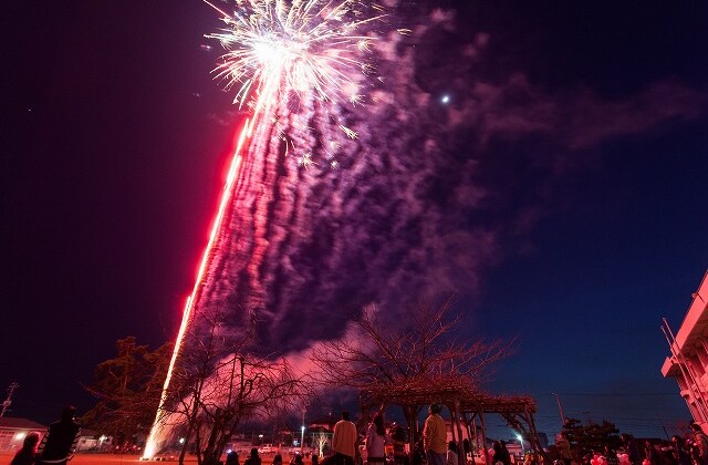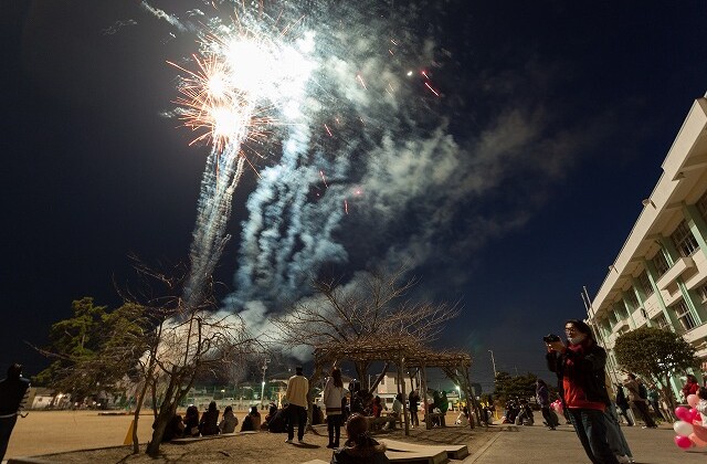 一日のイベントの最後には、初春夜の校庭で「鎮魂の桜花火」を打ち上げ、夜空にも一足早い花を咲かせました。