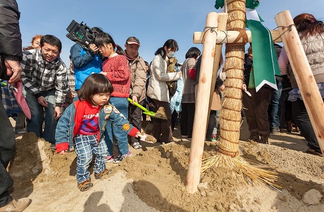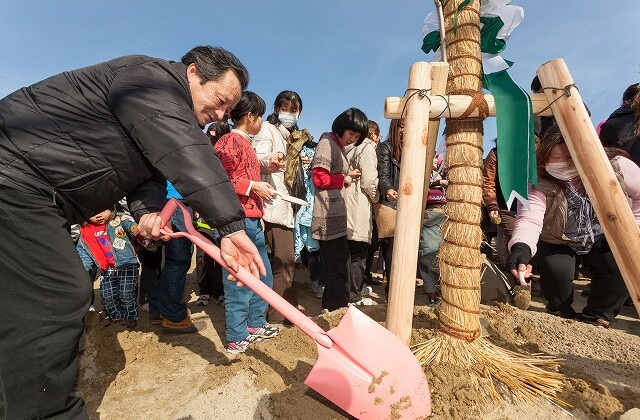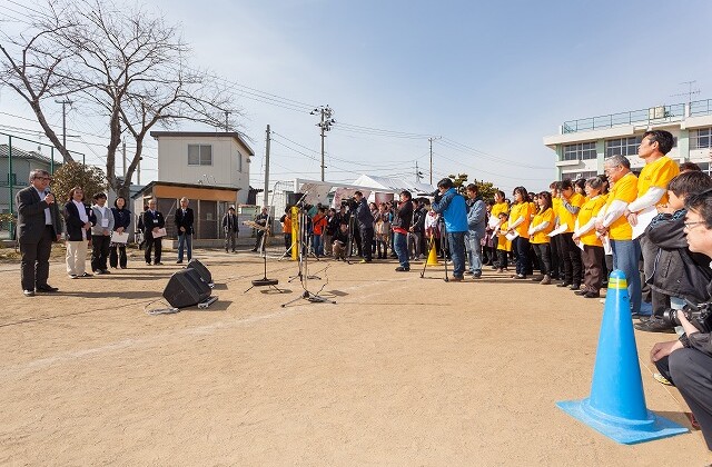 昨年3月2日に宮城県七ヶ浜汐見小学校から始まった桜3.11学校プロジェクトも、第4回目になりました。今回は、約200名の住民の方、小学校の生徒の皆さん、そして岡田小学校の高橋校長に参加していただき、高さ6メートルの桜を校庭に植樹しました。